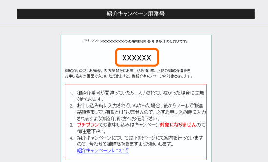 | 2. | 「お客様紹介キャンペーン番号」が表示されますので、この番号をご紹介頂く方にご連絡ください。 |