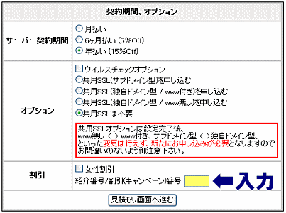 | ・サーバー契約期間 ・オプション ・割引(個人契約の女性の場合のみ、更に 女性割引 の適用が可能です) をご選択下さい。 |