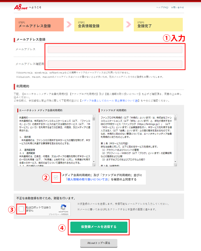 ①A8.netからのメールを受け取るメールアドレスを入力し、②利用規約をよく読み、規約に同意するチェックを入れてください。③不正な自動登録防止の認証をチェックしてください。④【仮登録メールを送信する】ボタンを押してください。