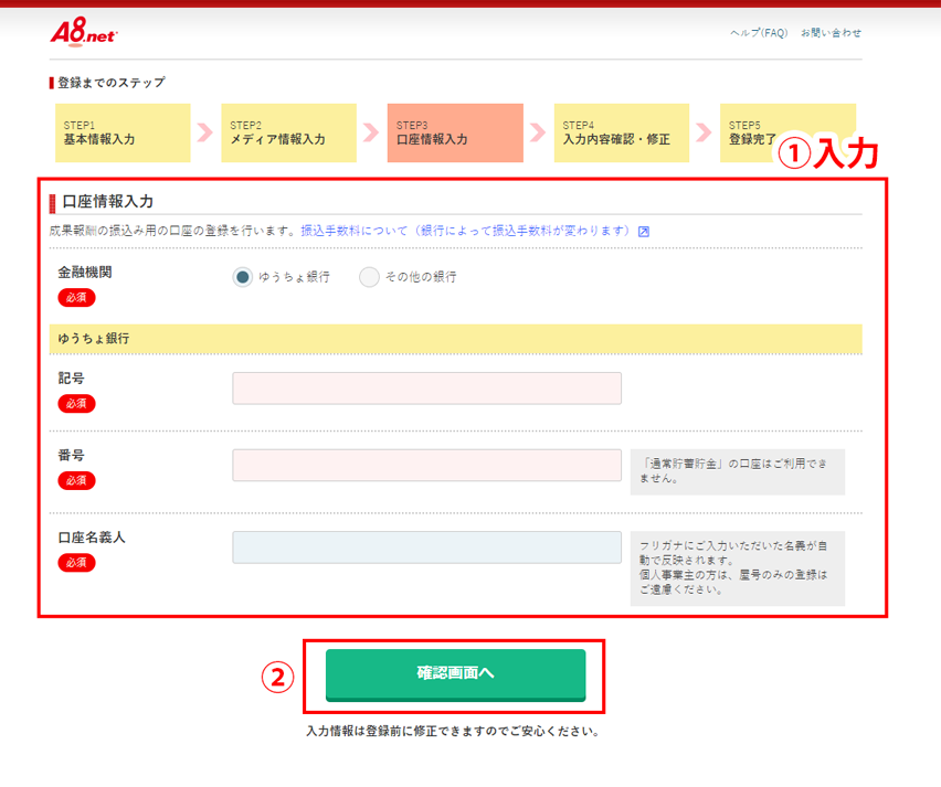 - ①A8.netで確定した成果報酬の払い込み口座を入力してください。②【確認画面へ】を押してください。