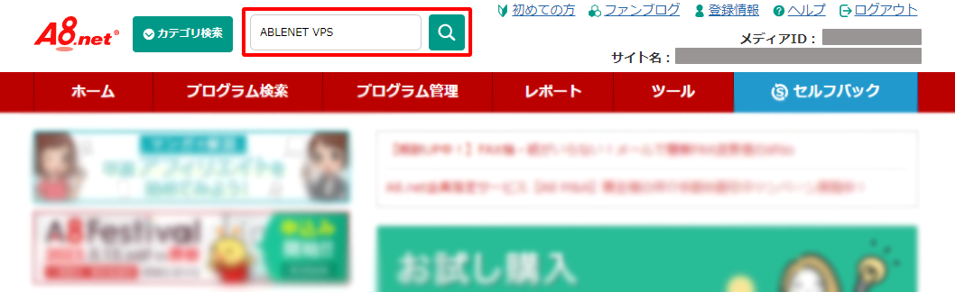 - A8.netにログインして、トップの検索エンジンから「ABLENET VPS」と入力して検索してください。