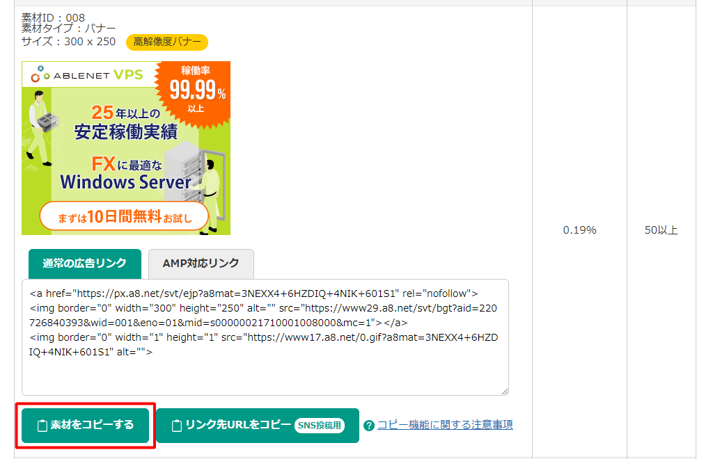 - 【コードを選択】ボタンを押すと広告タグが選択されるので、コピーしてお客様ご自身のHPやブログに貼り付けてください。これで設置完了です。