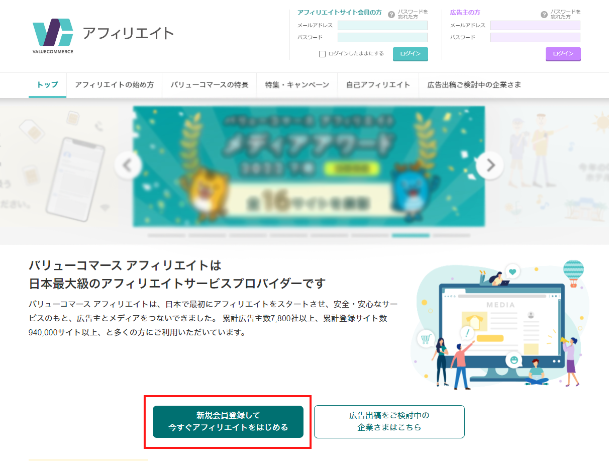 - バリューコマースのページから【新規会員登録をして今すぐアフィリエイトをはじめる】ボタンをクリックしてください。