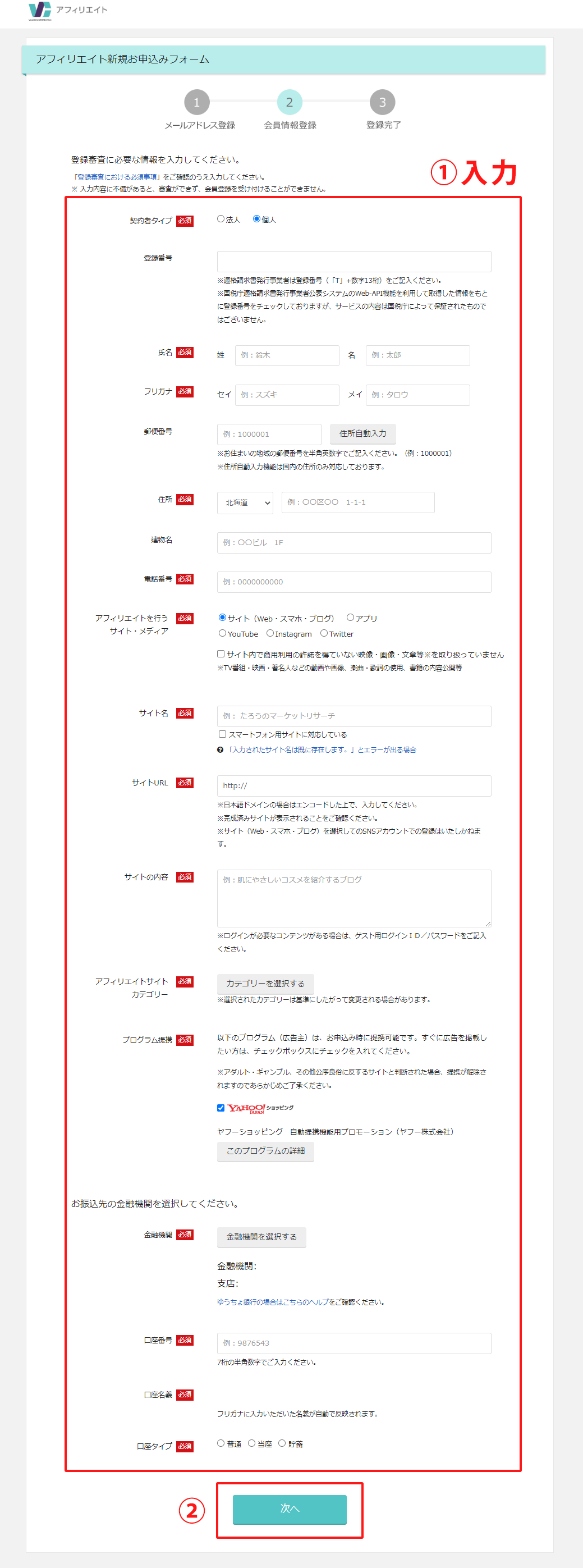 - ①Webサイトをお持ちの場合は運営しているWebサイトやブログの情報を入力してください。