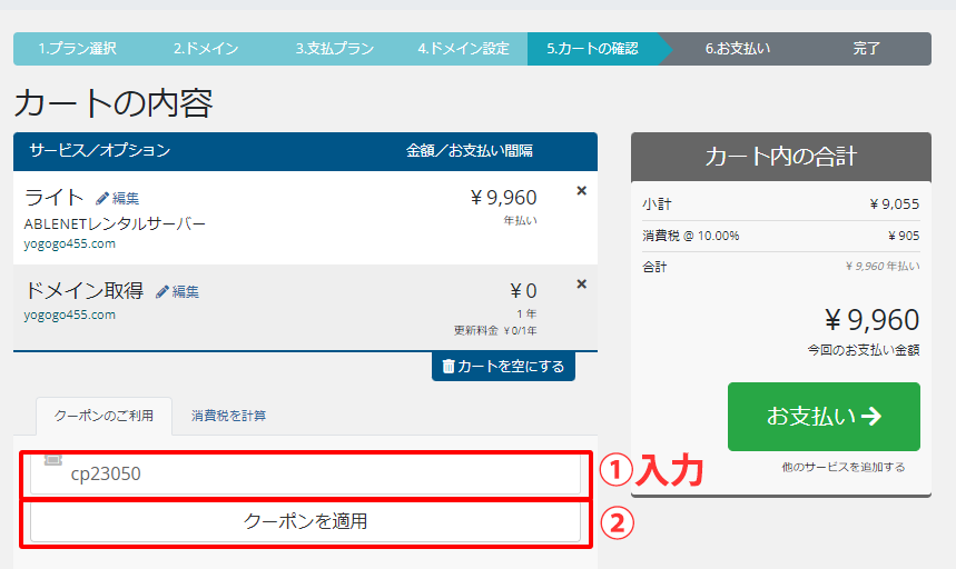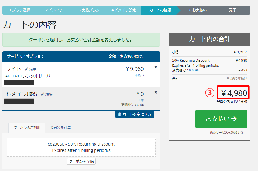 お申込み時、「5.カートの確認」画面で①「クーポンのご利用」にクーポンコード【cp23050】を入力後、②【クーポンを適用】を押してください。③「カート内の合計」の利用料金が半額になります。