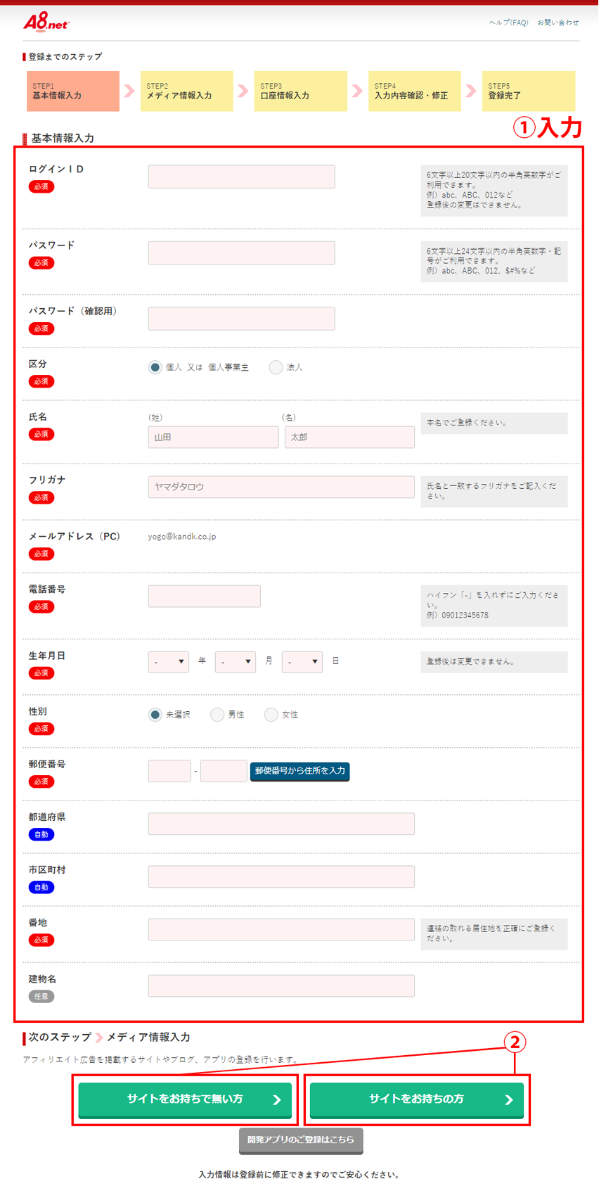 「A8.net登録用ページのURL」にアクセスをして、基本情報の入力ページに進み、①ログイン用のログインID・パスワードを決め、氏名や住所・生年月日等の契約者情報を入力してください。