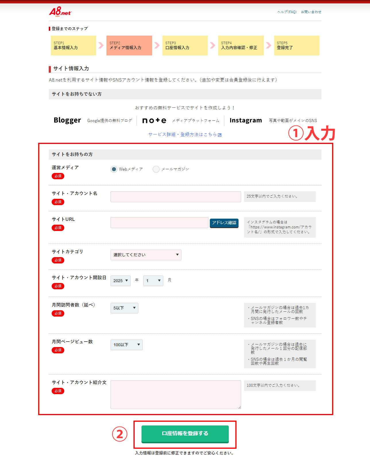 - ①Webサイトをお持ちの場合は運営しているWebサイトやブログの情報を入力してください。