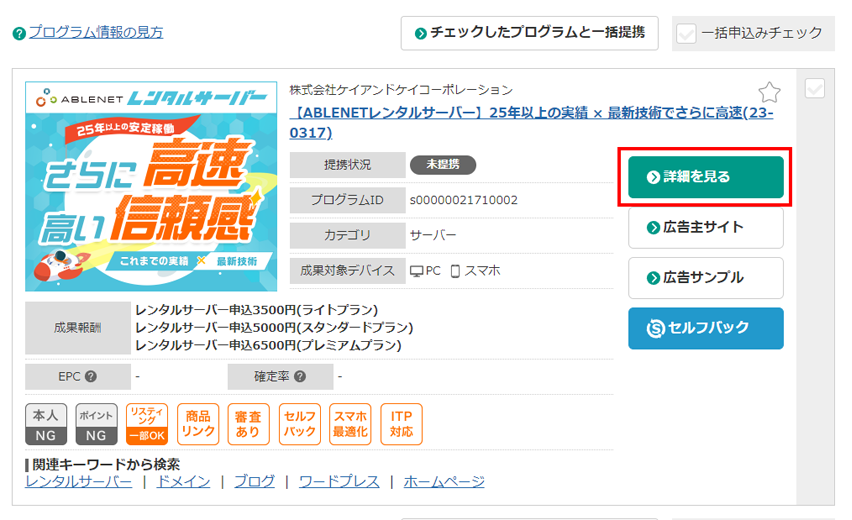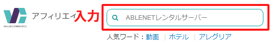 バリューコマースにログイン後、ページ上部の検索エンジンから「ABLENETレンタルサーバー」と入力し、検索してください。