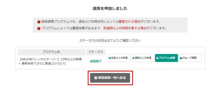 - 以下のように提携申請が完了したら、【検索結果一覧へ戻る】を押してください。