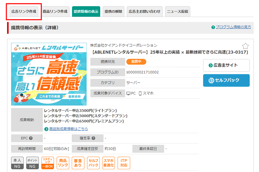 - アフィリエイトの登録(審査)完了後、ABLENET®のアフィリエイトプログラムと提携してください。