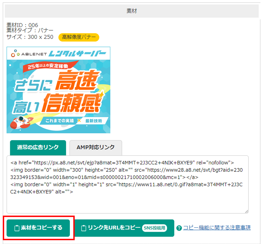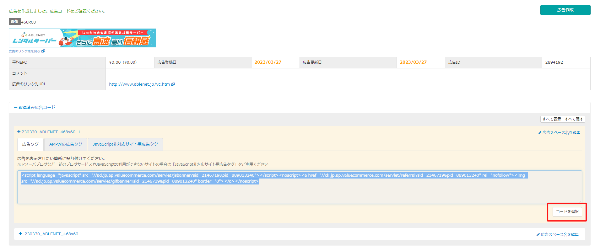 - 【コードを選択】ボタンを押すと広告タグが選択されるので、コピーしてお客様ご自身のHPやブログに貼り付けてください。これで設置完了です。