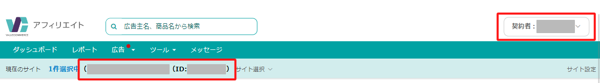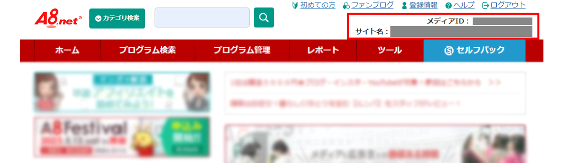 - ページ右上にお客様のメディアIDとサイト名が表示されていればログイン完了です。