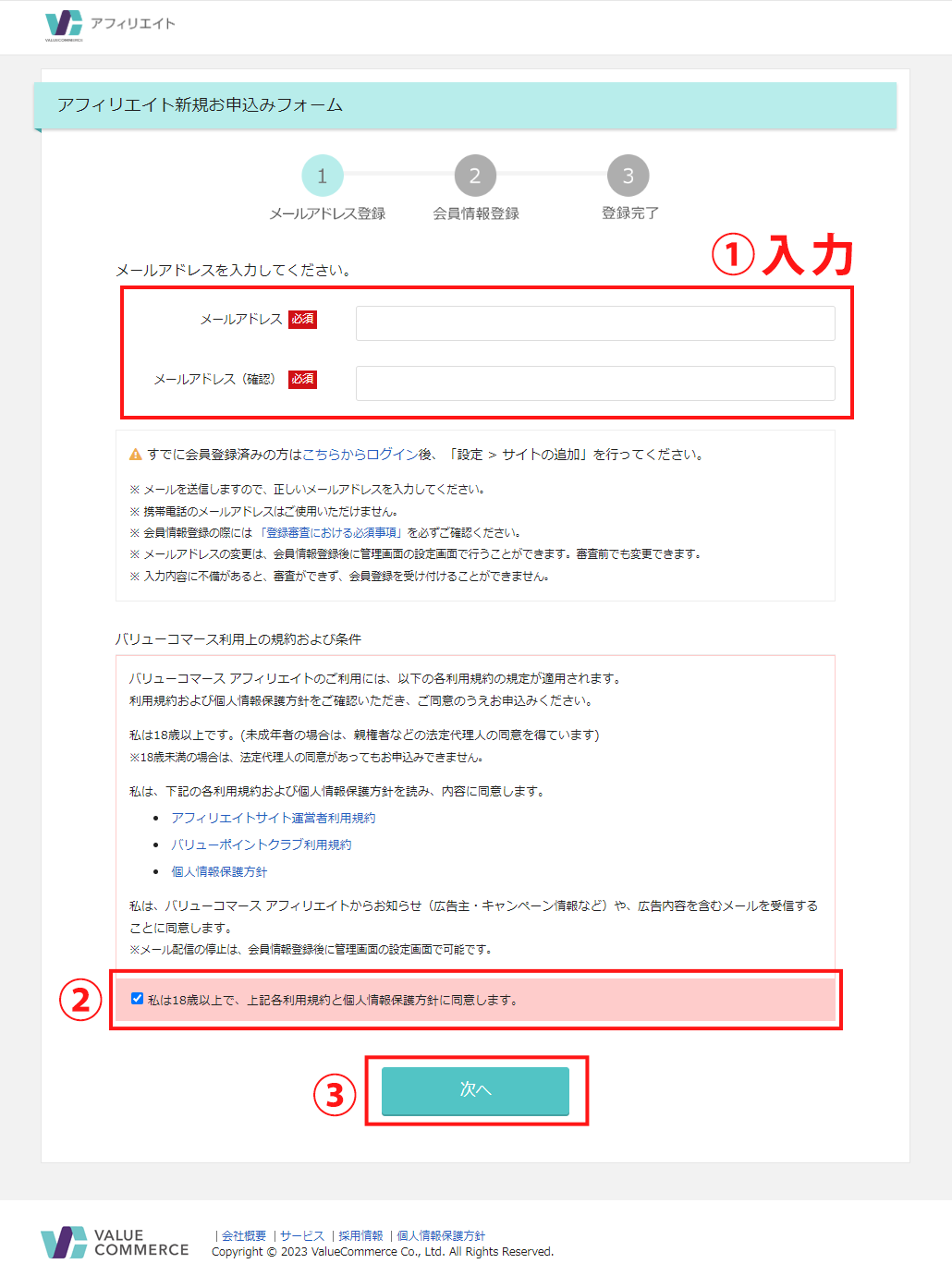 利用規約をよく読み、②【私は18歳以上で、上記各利用規約と個人情報保護方針に同意します。】にチェックを入れてください。