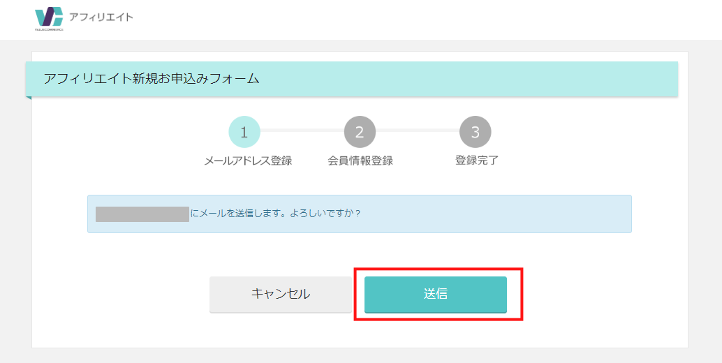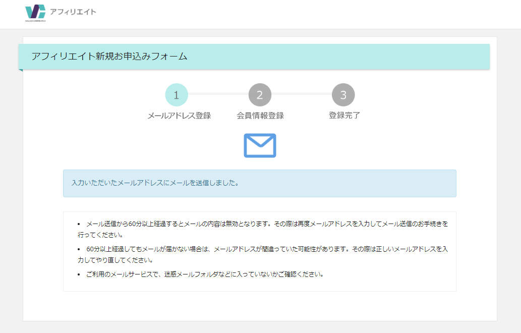 - 以下のような画面が出るので、入力したメールアドレスの受信メールからバリューコマースから送られてきたメールを開いて【登録用 URL】を押してください。