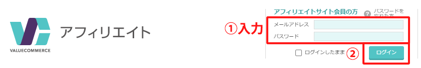バリューコマースのトップページ上部から①メールアドレスとパスワードを入力し、②【ログイン】ボタンを押してください。