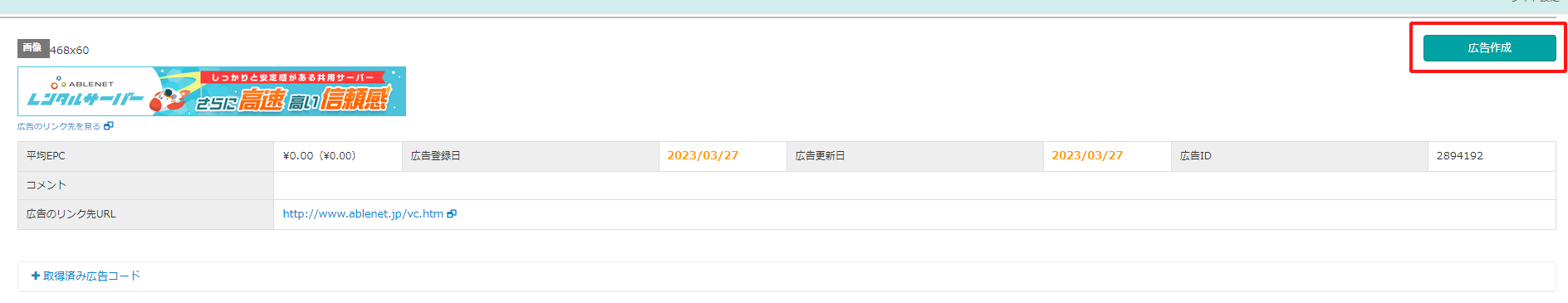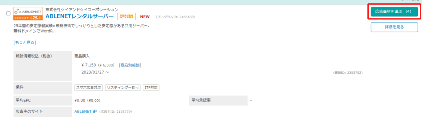 - 検索結果から「ABLENETレンタルサーバー」の【広告素材を選ぶ】ボタンを押してください。