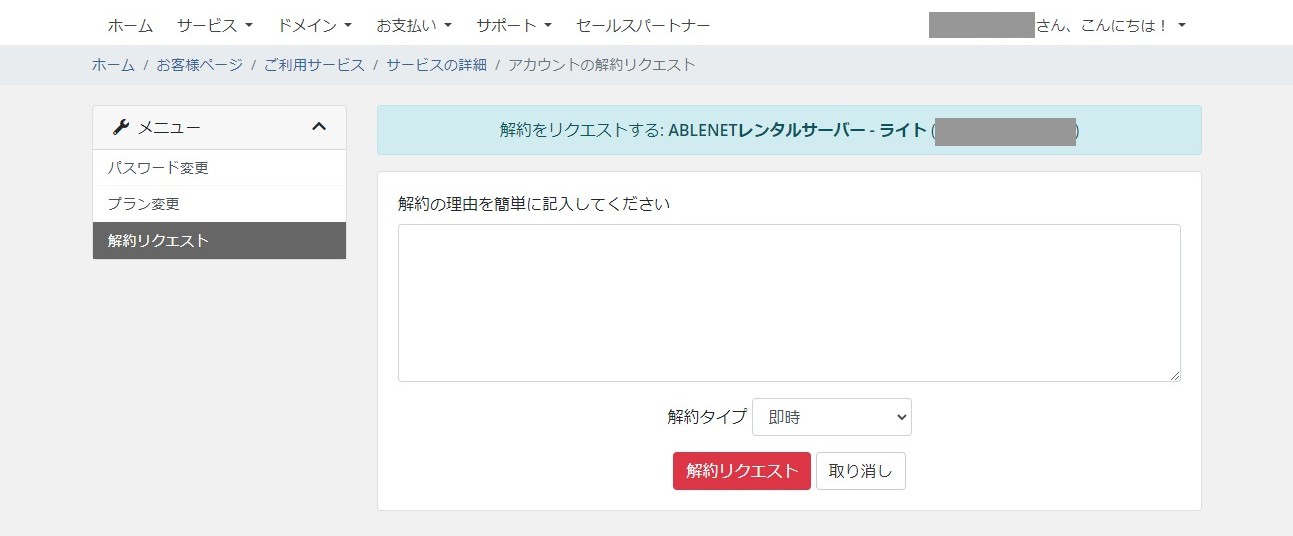 解約の理由を入力後、解約リクエストを押してください。