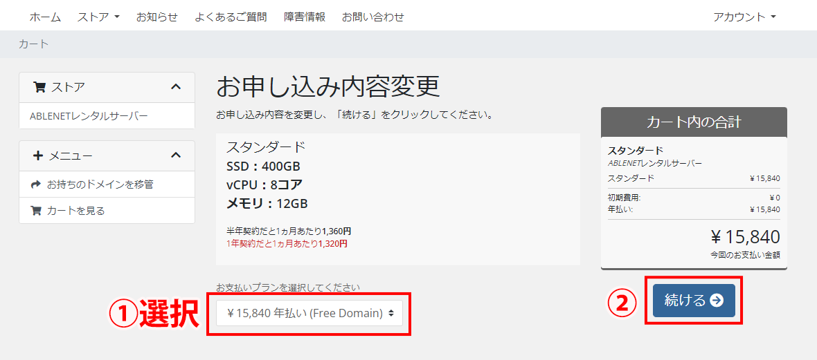 - ①お支払いプランを月払い、半年払い、年払いから選択し、②【続ける】ボタンを押してください。