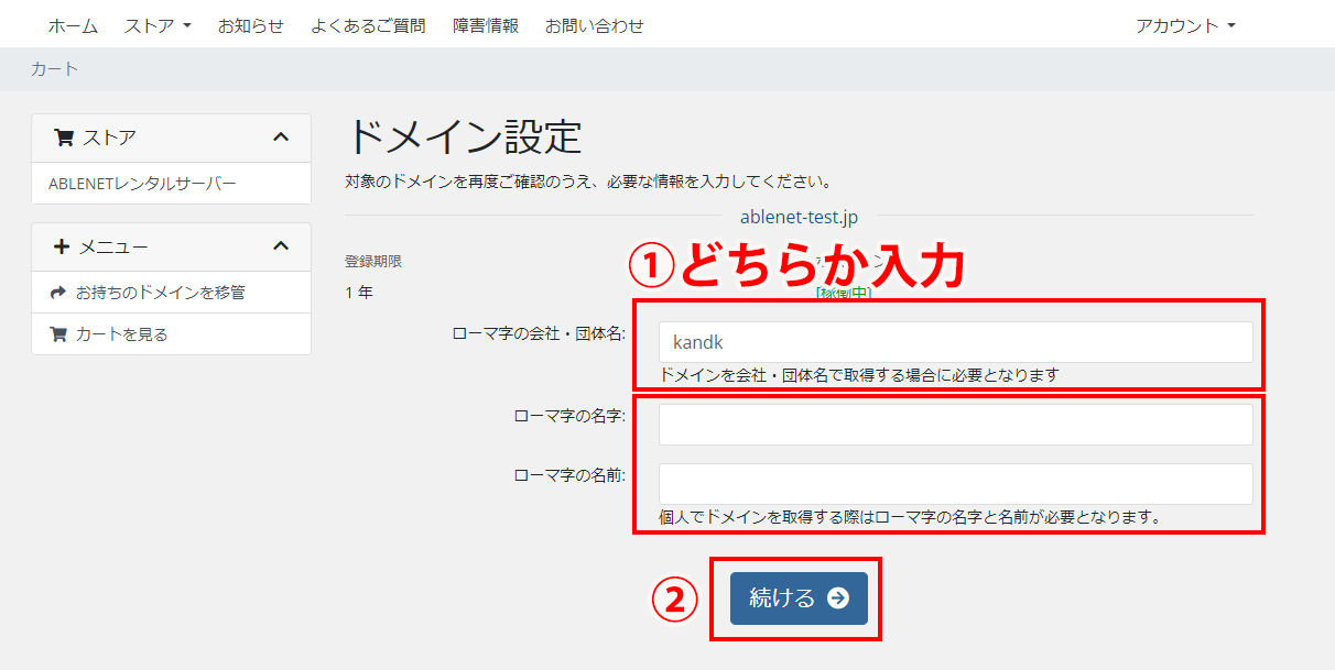 - jpドメインを取得する際には、①会社・団体で取得する場合は会社名・団体名のローマ字、個人で取得する場合は名字と名前のローマ字、どちらかを入力してください。