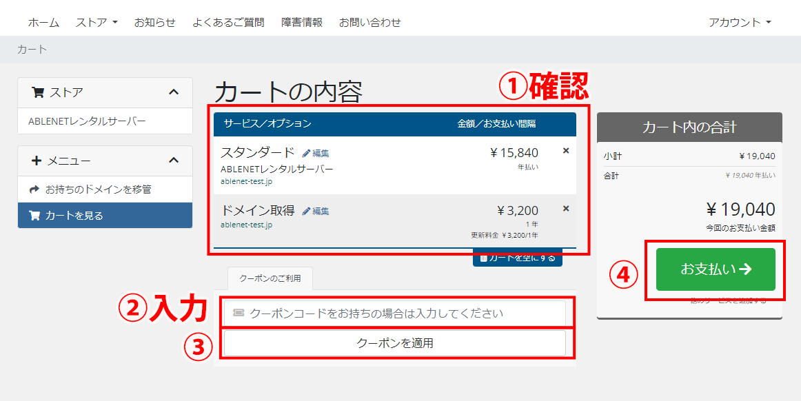- ①カート内容をご確認いただきお支払いを押してください。