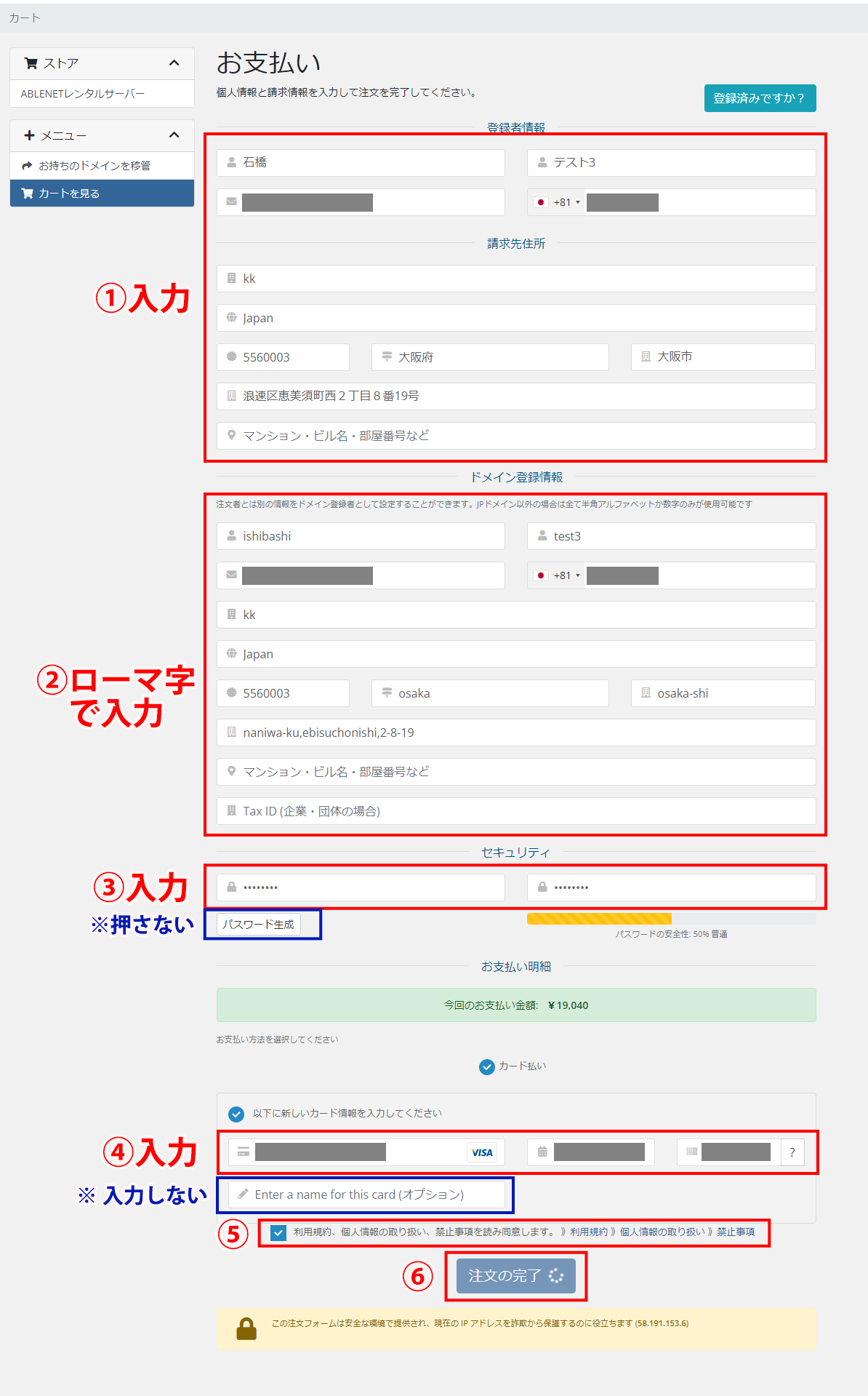 - ①登録者情報(日本語可)と請求先住所(日本語可)を入力してください。
