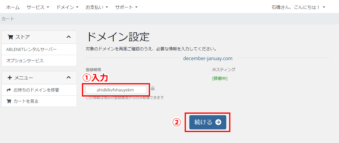 ②ドメイン登録情報(半角アルファベットか数字のみ)を入力してください。