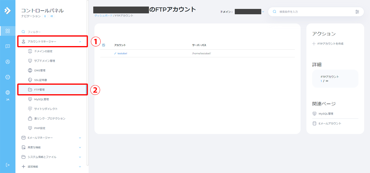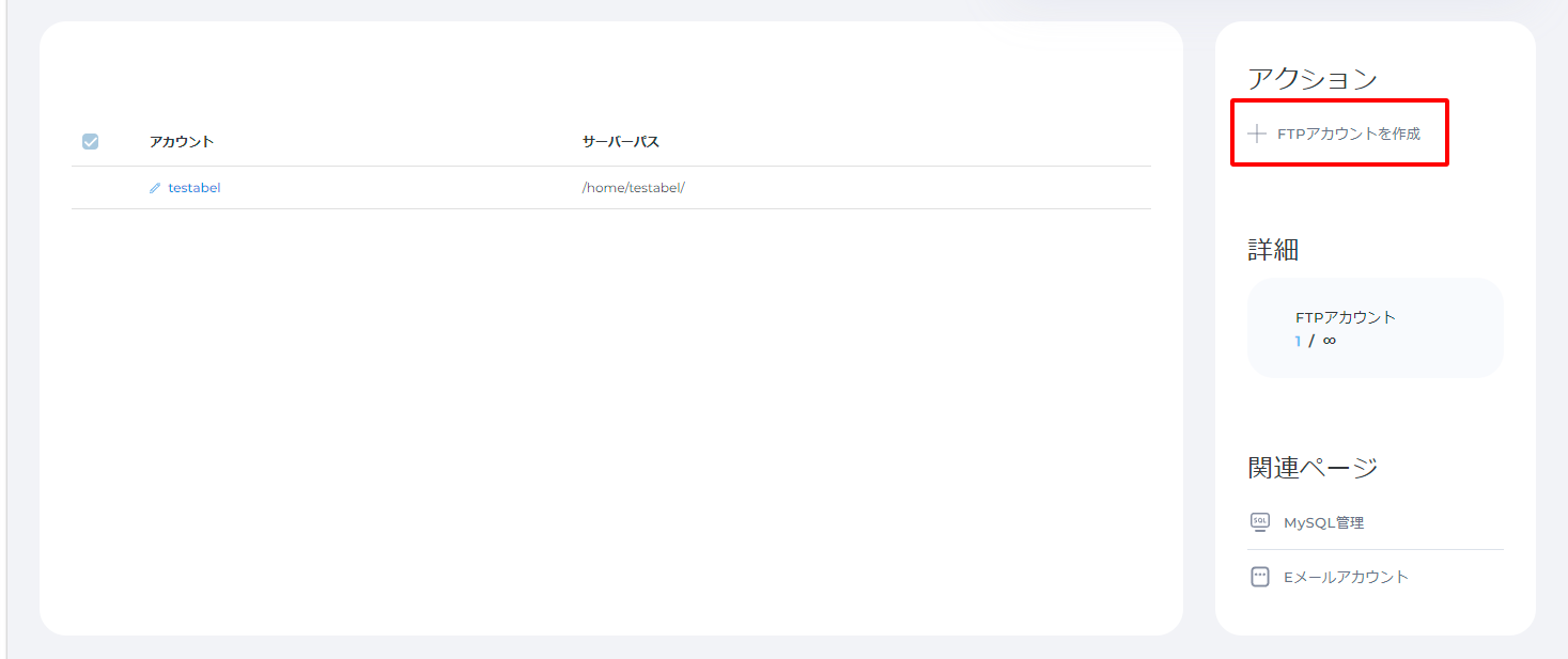 アクション(画面右側)FTPアカウントを作成を押してください。