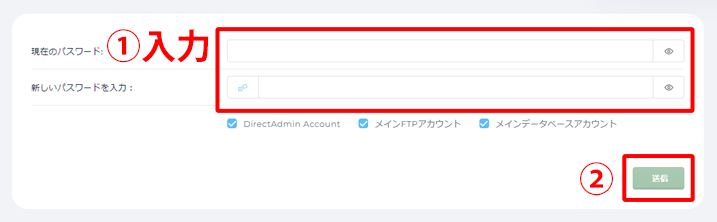 ①現在のパスワードと新しいパスワードを入力後、②【送信】をおしてください。