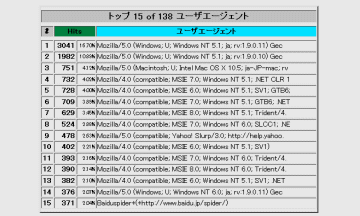 | トップ 15 of (個別ユーザエージェント数) ユーザエージェント / 訪問者の環境(ブラウザ・パソコン)のベスト15 |