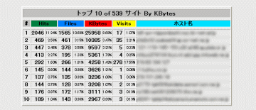 | トップ 10 of (個別サイト数) By KBytes / 幾度も訪れた訪問者の転送量ベスト10 |