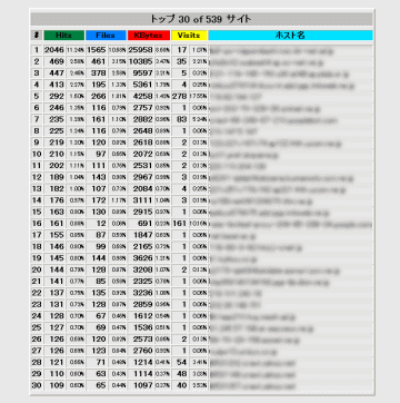 | ホスト名(ここではサイトの訪問者)が何回訪れたかのベスト30が確認できます。 |