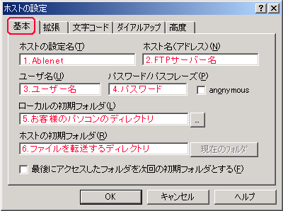 ここで必要になる入力情報は、全て「設定完了通知」に記載されております。 1. ホストの設定名 このFTPで使用するサービス・ホームページの名前等、お客様で自由に設定下さい。 (例:ABLENET®) 2. ホスト名(FTPサーバー名) 「設置完了通知」の「FTPサーバー」欄を参照して下さい。 (例:アカウント名.temporarydomain.net) 3. ユーザー名 「設置完了通知」の「ユーザー名(アカウントID) 」欄を参照して下さい。 4. パスワード 「設置完了通知」の「パスワードその1」欄を参照して下さい。 5. ローカルの初期フォルダ(お客様のパソコンのディレクトリ) パソコンの中でホームページを保存しているディレクトリを設定してください。 ※横にあるボタンをクリックしてホームページデータのファイルを選択して下さい。 (例:C:\Documents and Settings\Administrator\デスクトップ\myhomepage) 6. ホストの初期フォルダ(ファイルを転送するディレクトリ) 「設置完了通知」の「ファイル転送先ディレクトリ(フォルダ)」を設定して下さい。 (例 /お客様のドメイン名/)※前後の「/」(スラッシュ)を忘れないで下さい。 |
