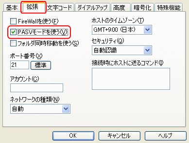 | 4. | 「「拡張」タブを選択し、「PASVモードを使う」をチェックしてください。 |