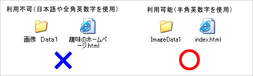 | ファイル名に利用できない文字 | 「スペース」「日本語」「全角の英数字」などは使用しないで下さい。 |