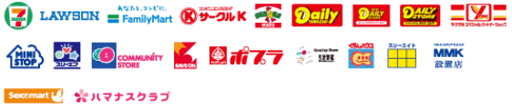 セブンイレブン ポプラ/生活彩家/くらしハウス ローソン スリーエフ セーブオン ミニストップ コミュニティストア ファミリーマート デイリーヤマザキ サンクス MMK(マルチメディアキオスク) サークルK セイコーマート(北海道、関東地区のみ) ハマナスクラブ(一部)