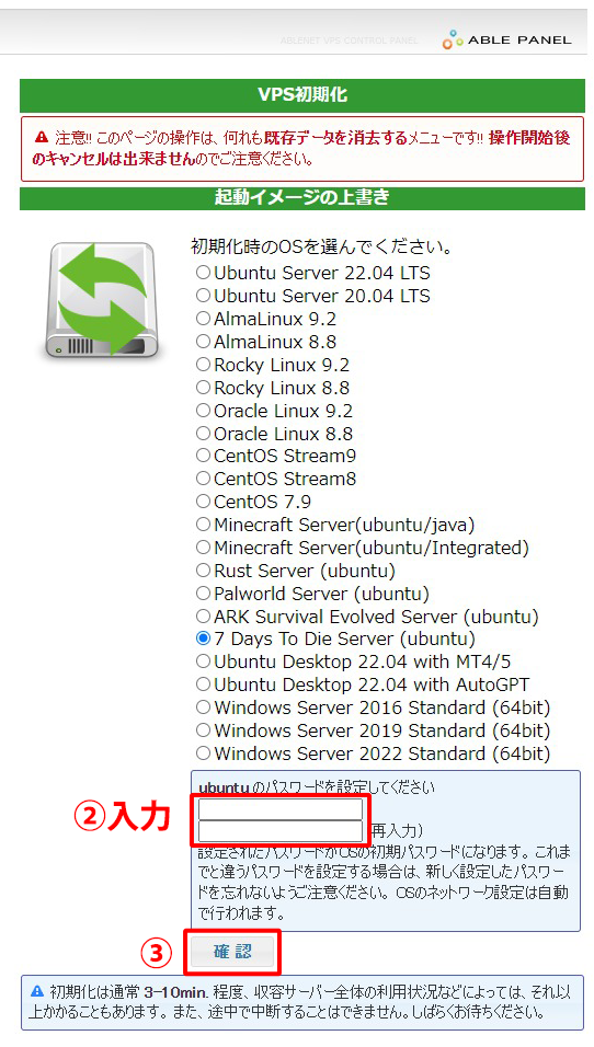 - 起動イメージの上書きの中から、①【7 Days to Die Server (ubuntu)】を選択し、②パスワードを入力後、③【確認】を押してください。