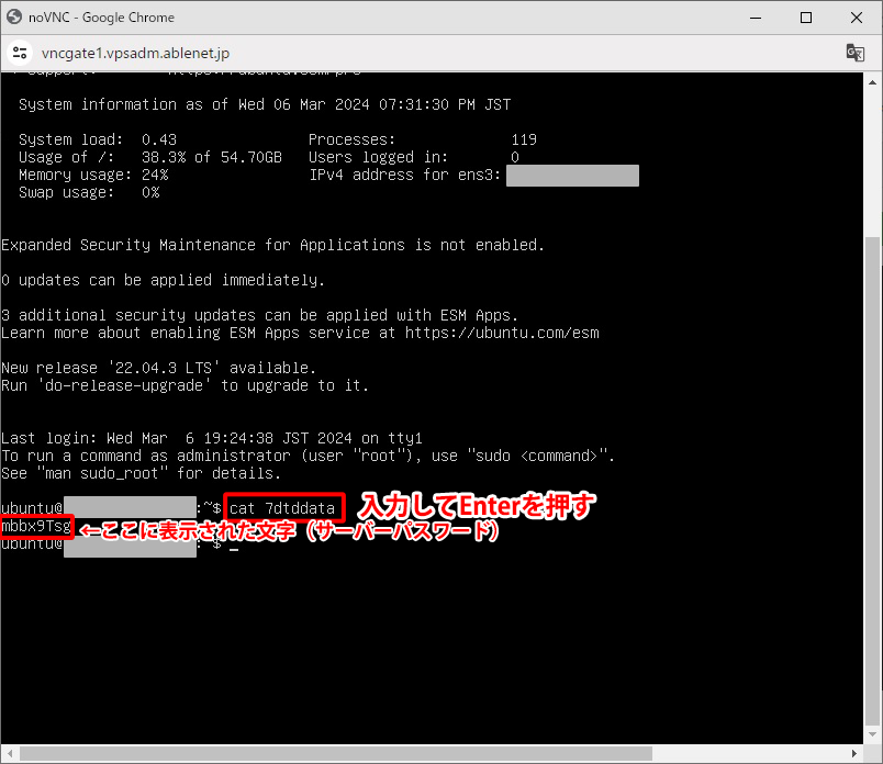 - ログイン後、【cat arkdata】を入力し、【Enter】を押してください。