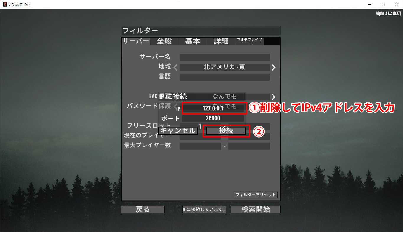 - ①127.0.0.1を消し、【IPv4アドレス】を入力後、②【接続】を押してください。