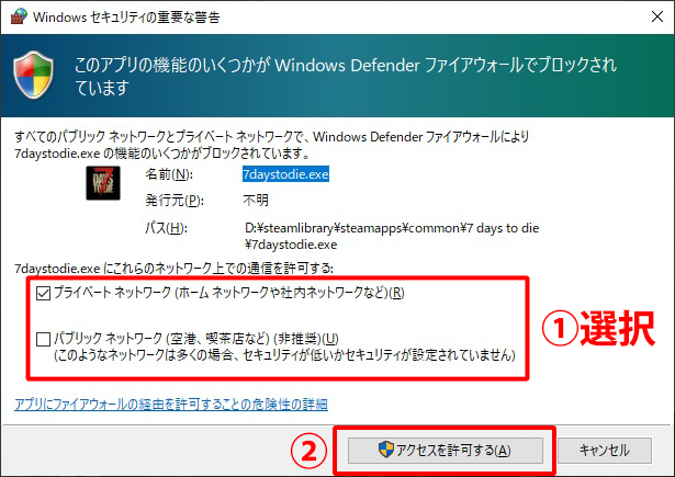- Windowsセキュリティの需要な警告が出た場合は、①通信を許可するネットワークを選んで②【アクセスを許可する】を押ししてください。