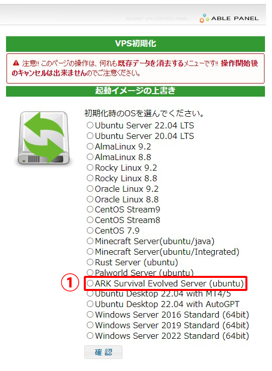 - 起動イメージの上書きの中から、①【ARK Survival Evolved Server (ubuntu)】を選択し、②パスワードを入力後、③【確認】を押してください。