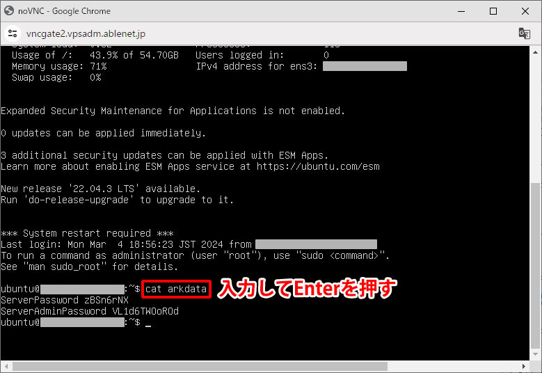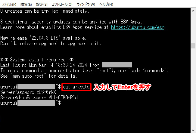 - ログイン後、【cat arkdata】を入力し、【Enter】を押してください。