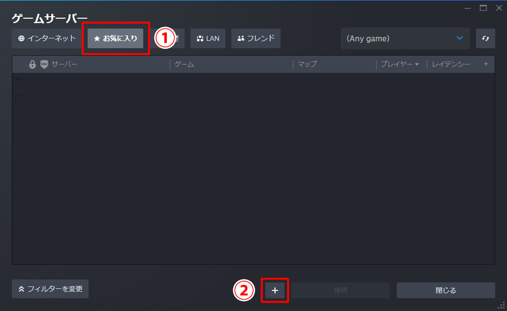 - Steamを起動し、①上部メニュー表示⇒②【ゲームサーバー】を押してください。