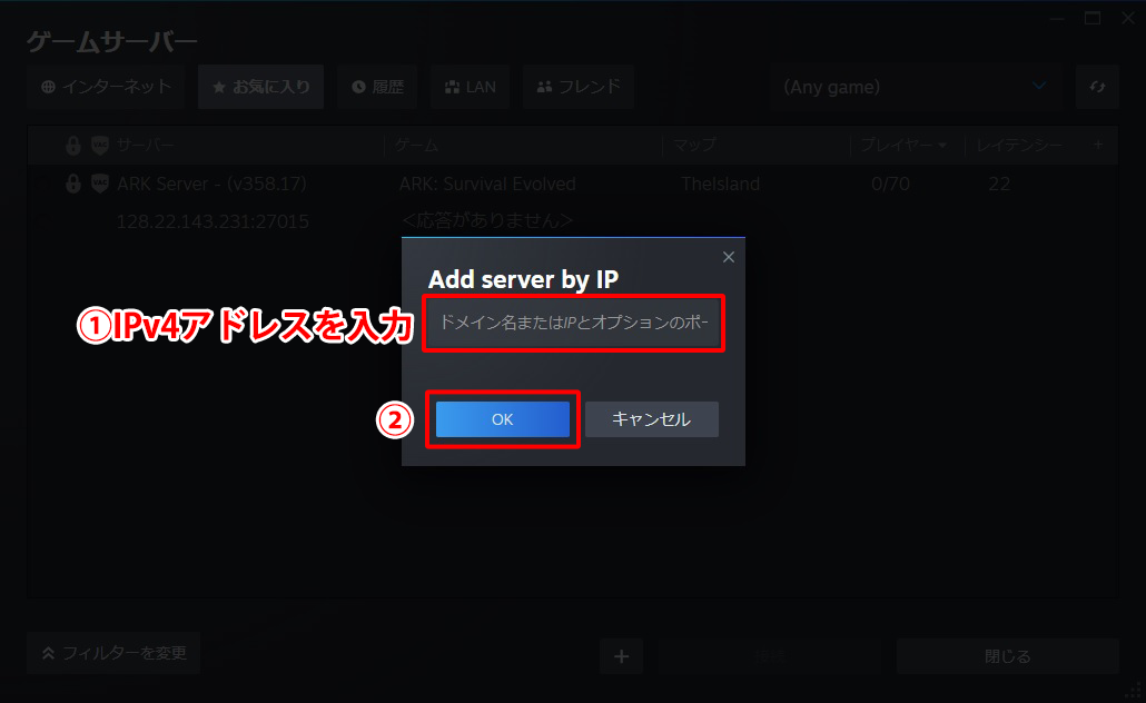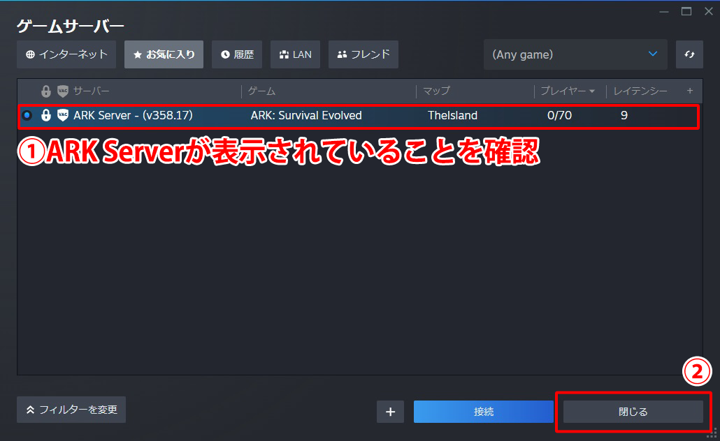- ①ARK Serverが表示されていることを確認し、②【閉じる】を押してください。
