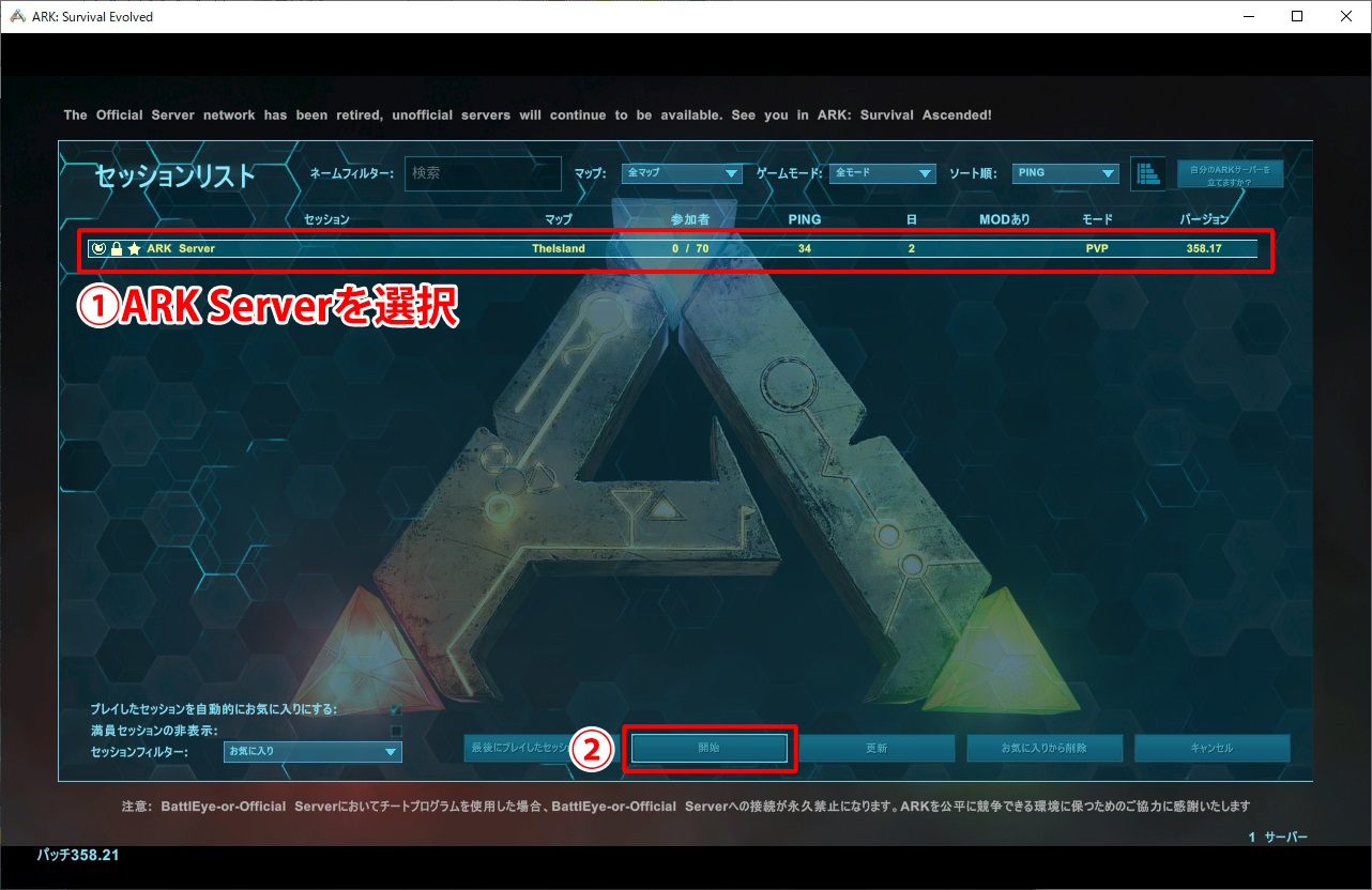 - ①ARK Serverを選択し、②【開始】を押してください。
