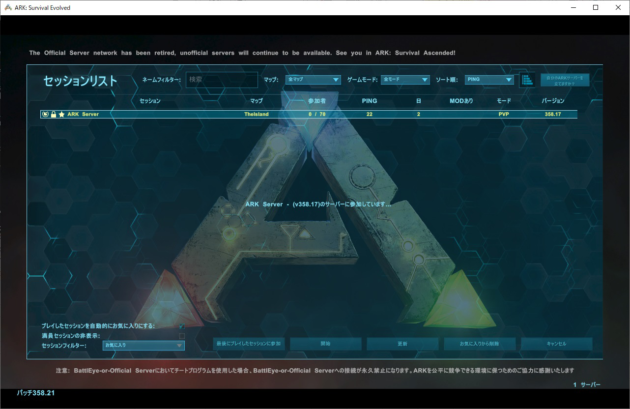 ※ログイン画面が表示さてもARKサーバーの起動が完了するまでに約10分~15分かかります。